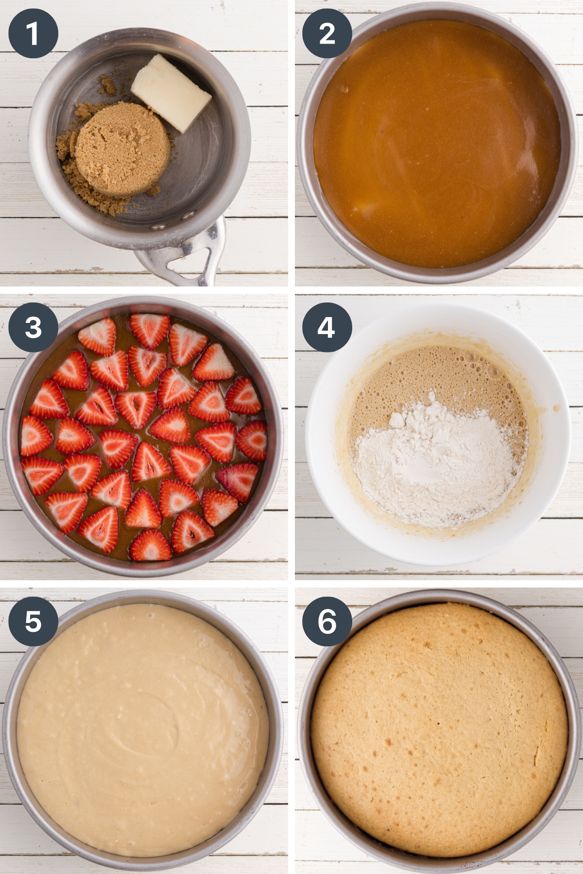 - The strawberry layer. Arrange the sliced strawberries over the brown sugar mixture, pressing them into the sugar and butter mixture gently so that they stay in place.