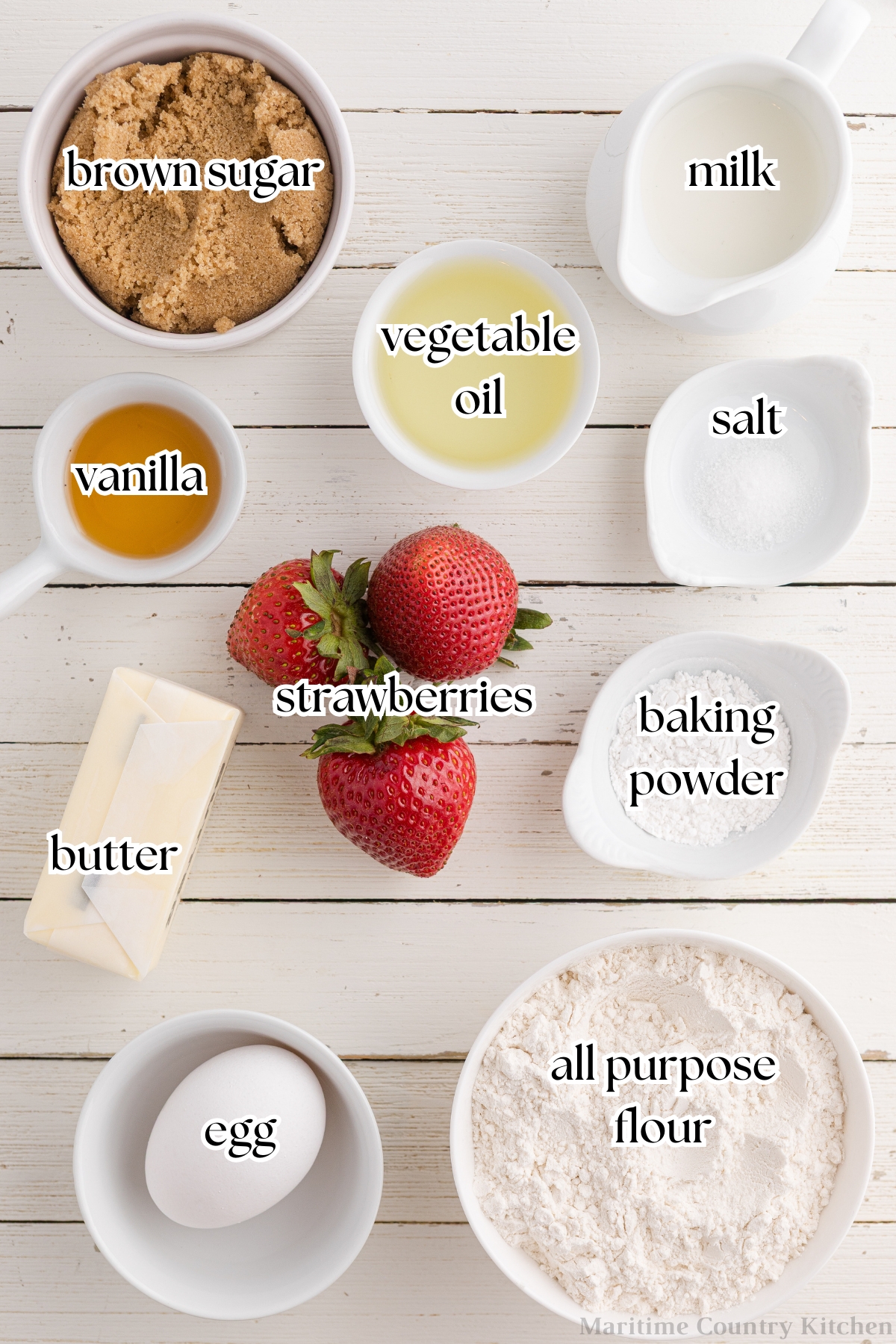 - For the homemade cake layer: flour, oil, more brown sugar, egg, milk, vanilla extract, baking powder, and salt.