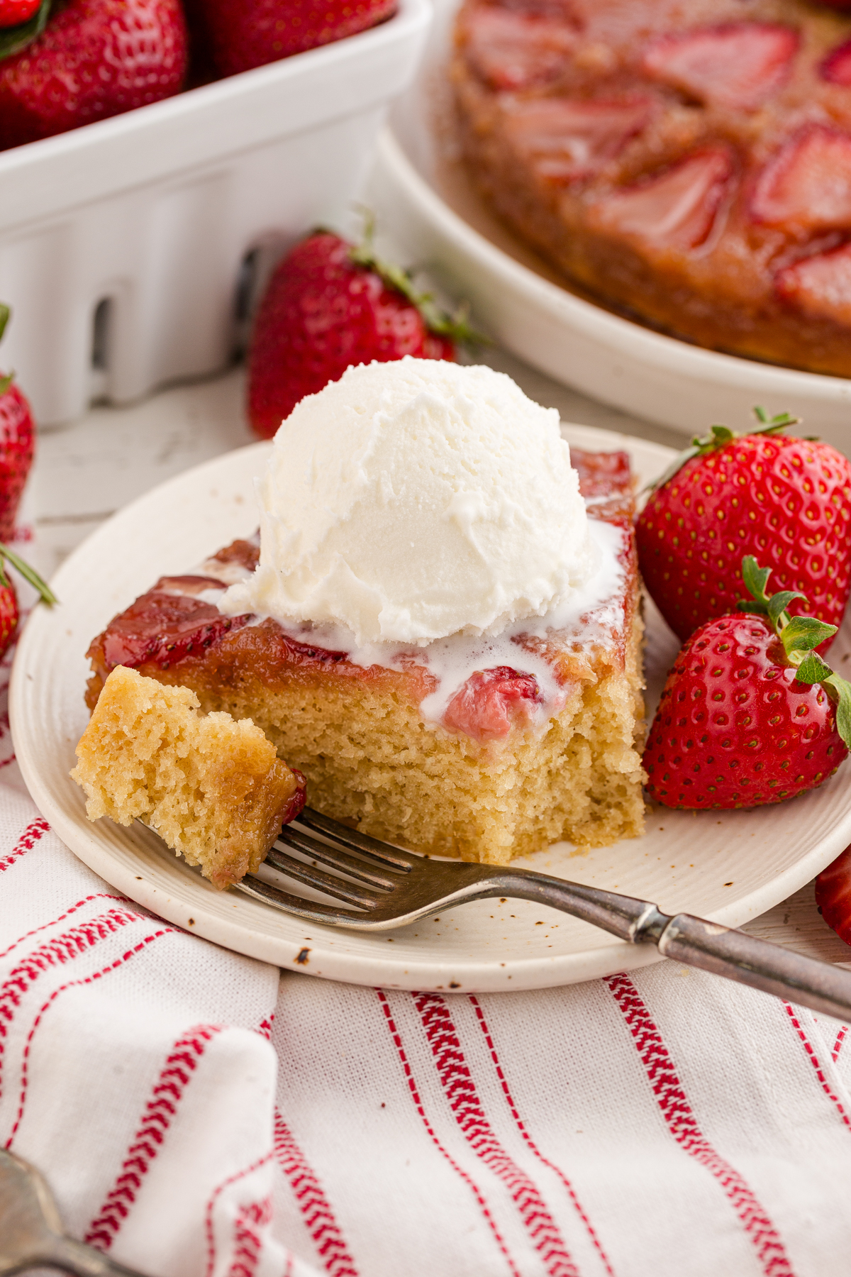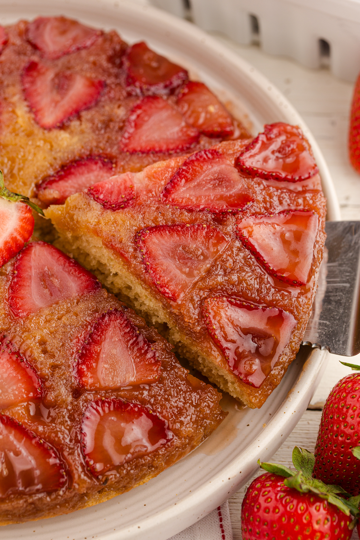 Allow the cake to cool at room temperature before slicing…but it's okay if you need to eat it warm, I get it! Just keep in mind that the strawberries may slip around a bit if sliced too early.